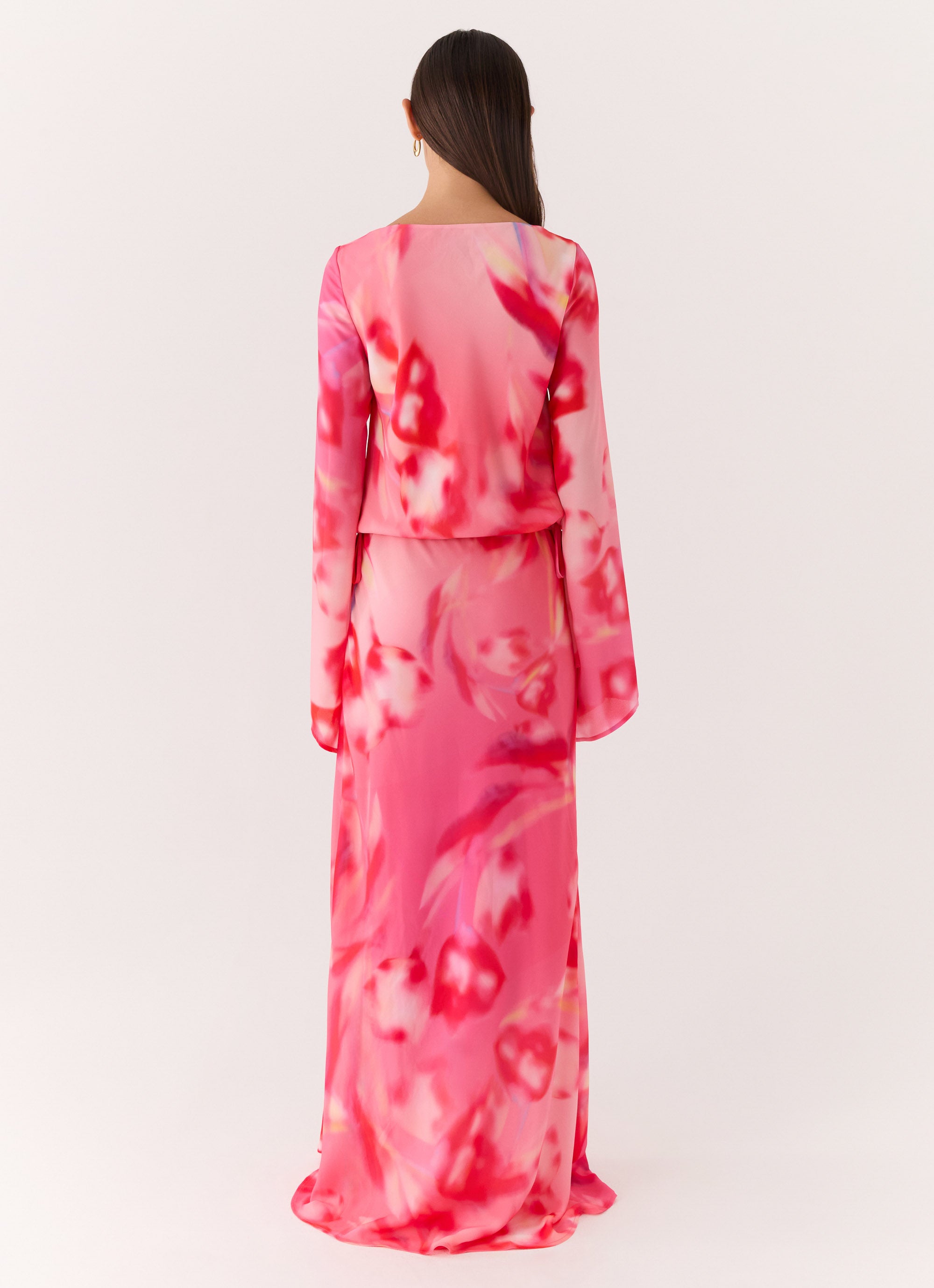 The Rafaella Maxi Dress brings effortless drama with its flowing silhouette and soft, feminine details. Designed with a blouson bodice and a tie front bust, it falls into a sweeping maxi length enhanced by a striking front leg split. Crafted from airy bias cut chiffon with long bell sleeves, it moves beautifully with every step.