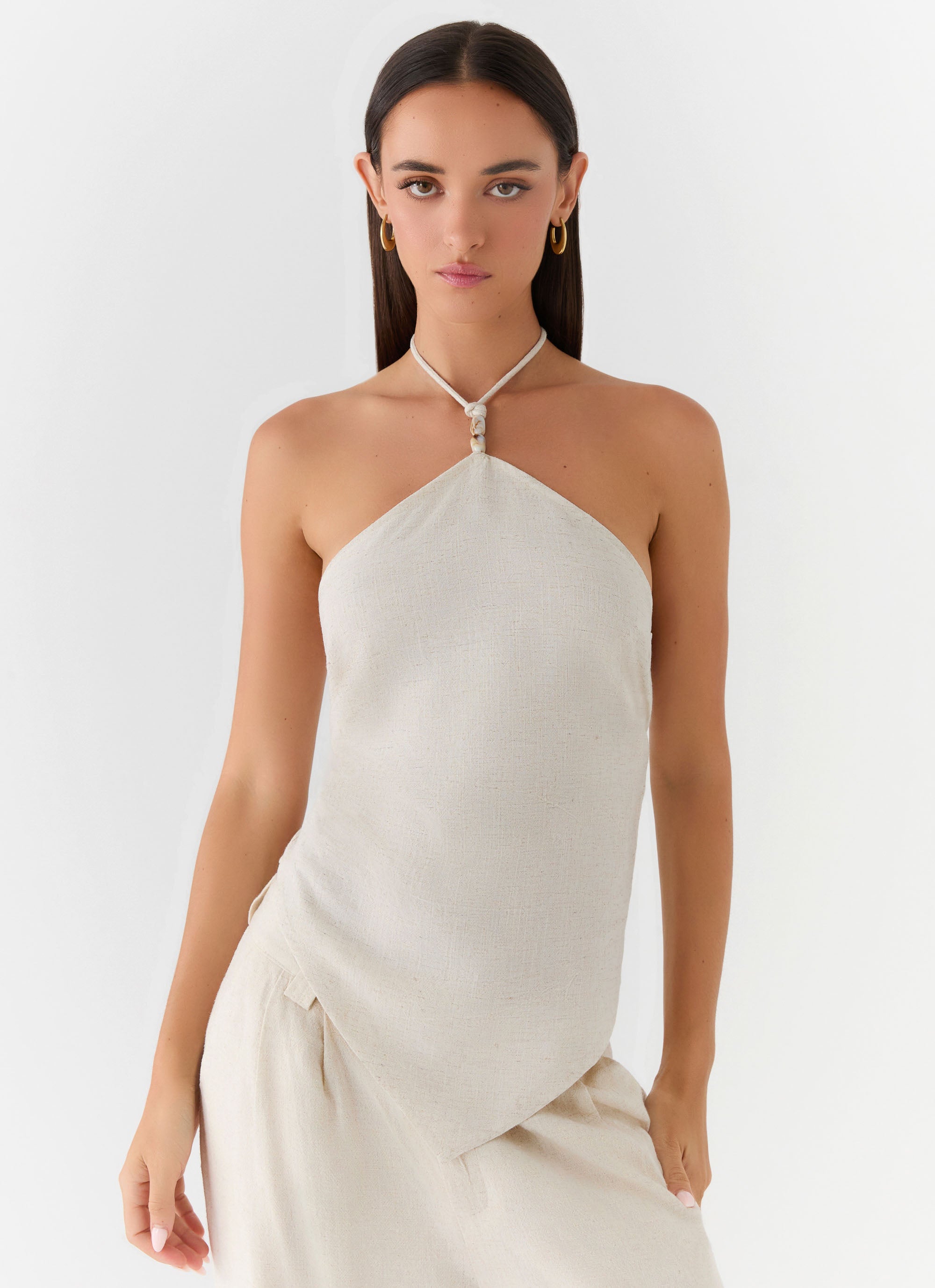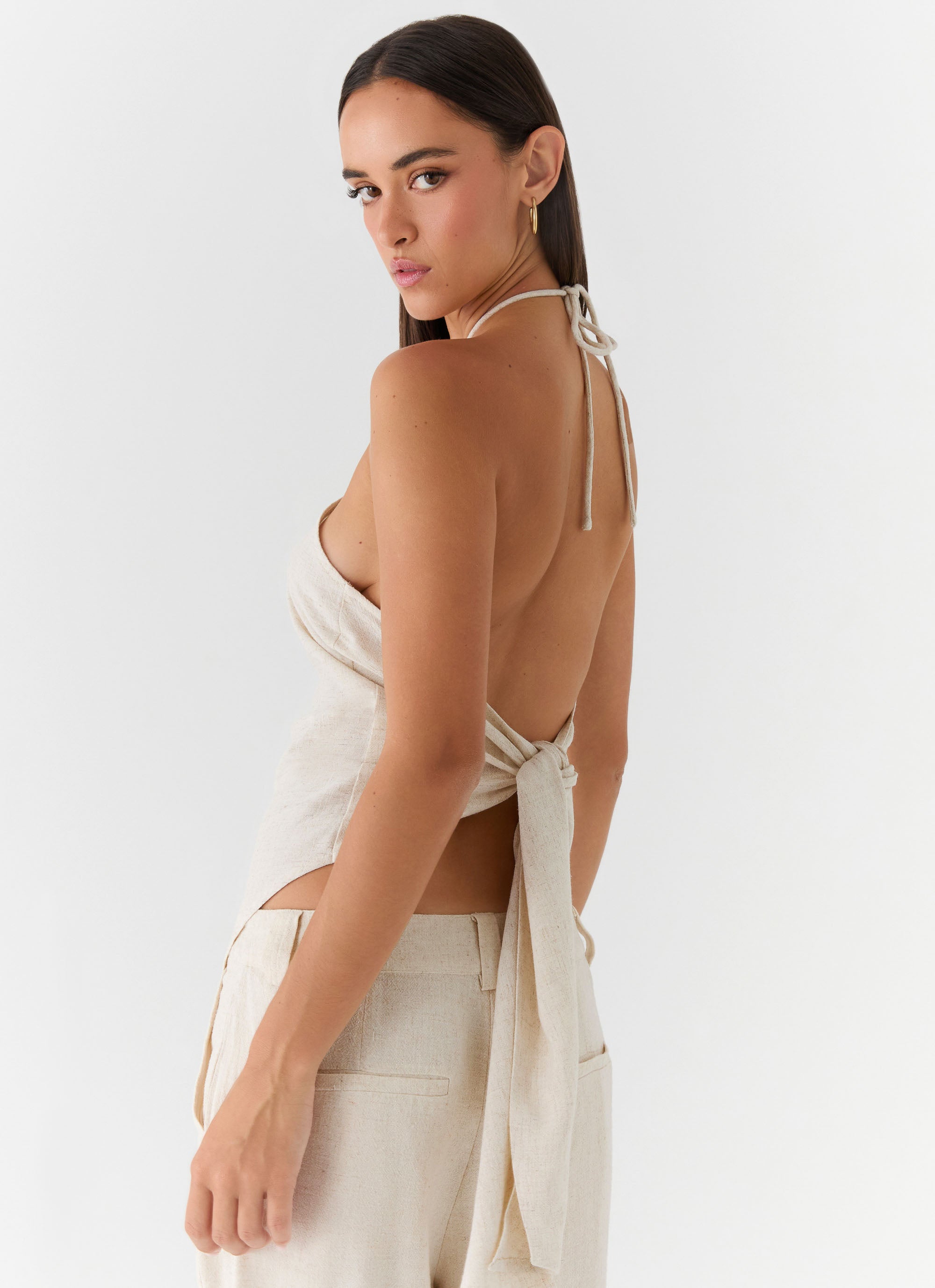 The Julissa Halter Top features a sophisticated halter neckline, an open back, and a delicate beaded strap. This unlined silhouette is designed with a versatile back tie and an exclusive print, ensuring a unique and elevated look for every wearer.