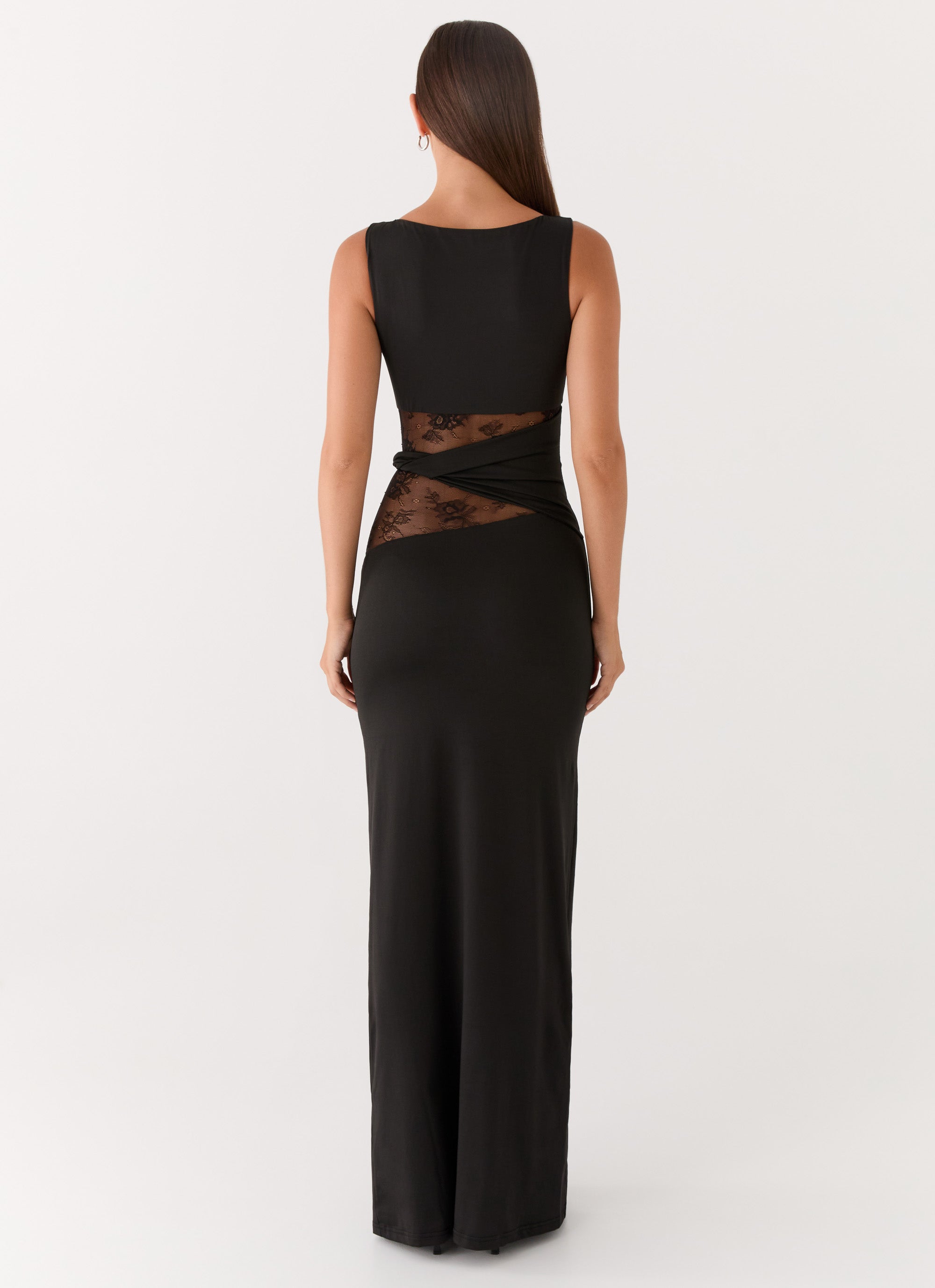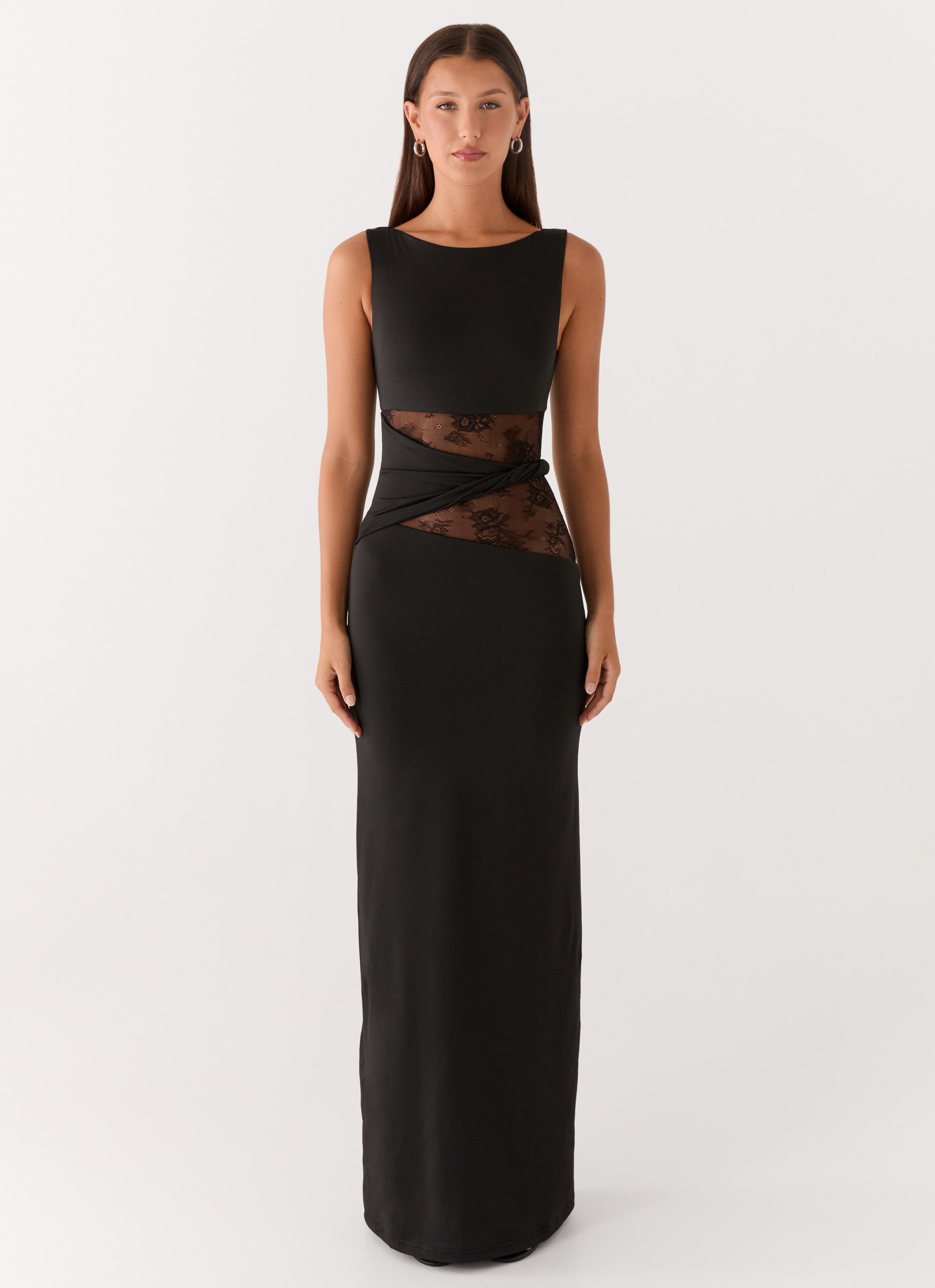 The Karma Maxi Dress is made for golden hour elevation and nights that demand unforgettable allure. Featuring a sophisticated rounded neckline and a sleek stretch jersey fit, this silhouette is artfully interrupted by a delicate semi-sheer lace waist and twisted waistband detailing. With a perfectly lined bodice and skirt, it balances comfort with a daring edge, making it the ultimate statement piece for sunset-to-after-dark glamour.