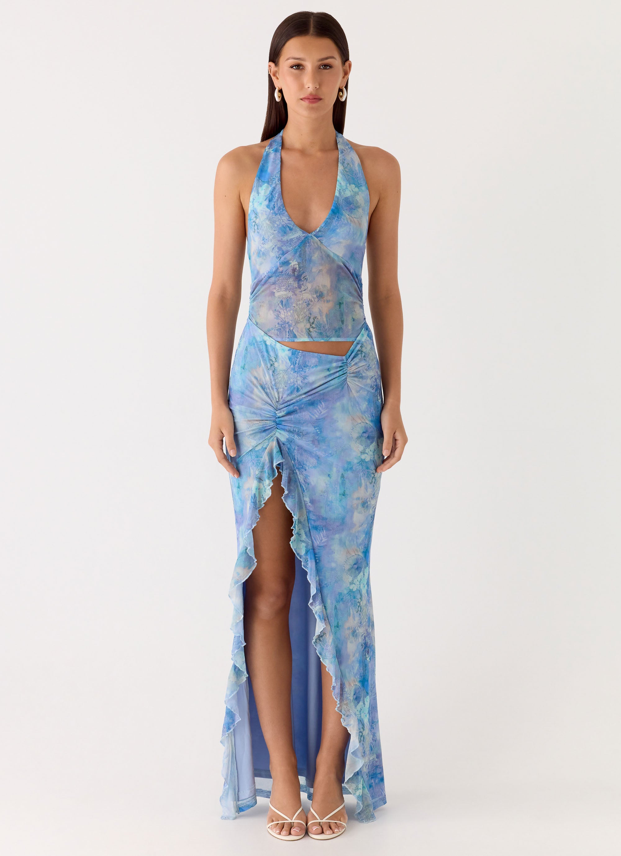 The Last Sequence Maxi Dress is your after-dark essential. Cut from stretch mesh with a halter neckline and tie straps, this body-skimming maxi is detailed with ruffles and a thigh-high split for a playful finish. The bust and skirt are lined in jersey for comfort, while the sheer elements keep it flirty.